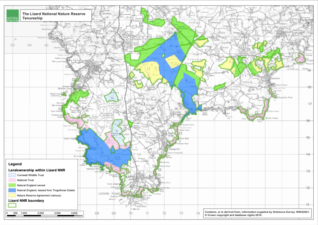 The Lizard NNR covers 2400 ha.  It comprises land managed by Natural England (the Government-funded conservation body), National Trust, Cornwall Wildlife Trust, Cornwall Birdwatching Preservation Society and private landowners. Highlights of this wonderful expanse of landscape include:
