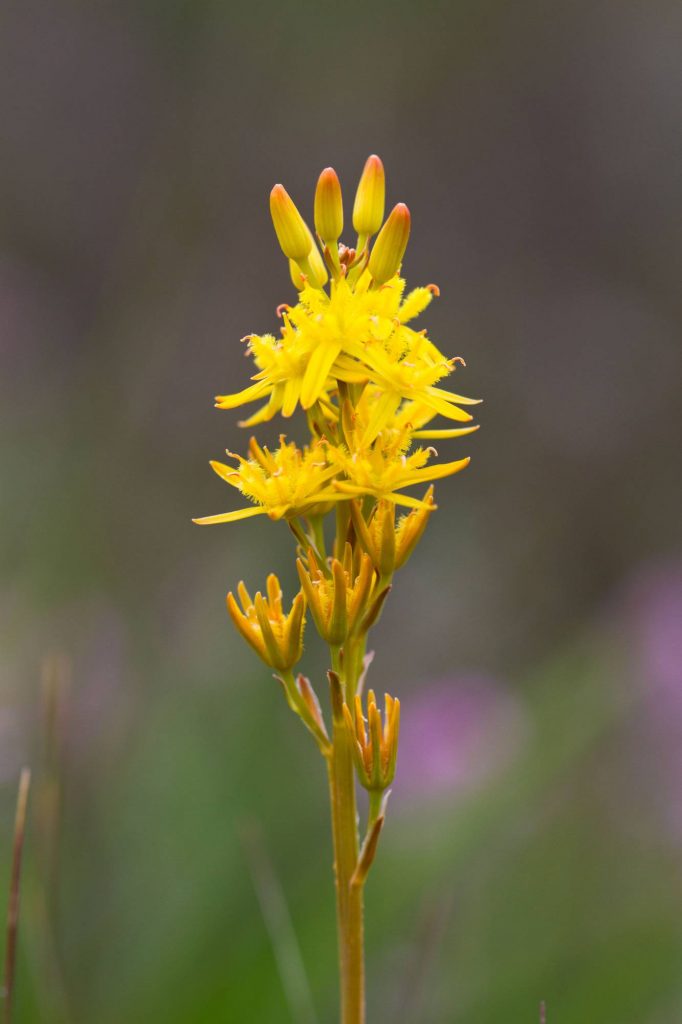 Its name is a pretty good clue to where you’ll find the vivid yellow, starry flowers of Bog Asphodel. It likes to grow in damp, boggy heathland. This habitat is poor in nutrients; this gained the plant a reputation for causing brittle bones in sheep feeding on it, but the cause was in fact the lack of calcium, an essential nutrient for the animals, in the soil. Even so, you’ll still sometimes hear Bog Asphodel called Bonebreaker.